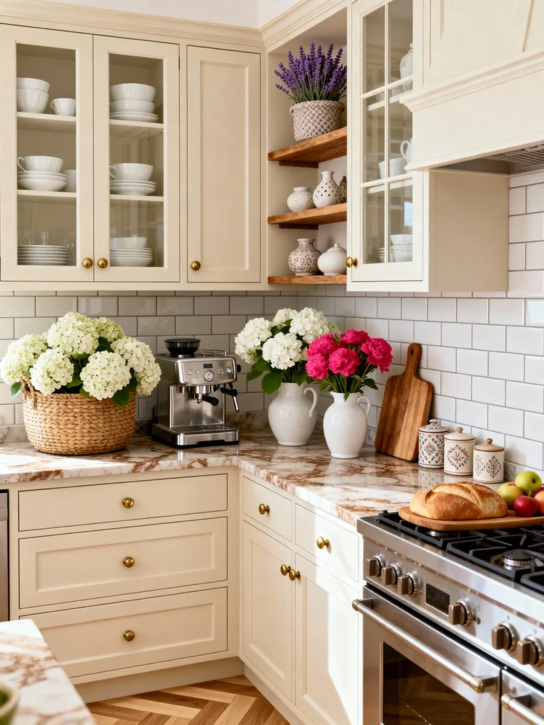 Doesn’t this kitchen just radiate warmth? The creamy, off-white cabinets feel instantly welcoming, especially paired with those gorgeous brass hardware pulls that add a touch of classic elegance. I love how they broke up the wall cabinets with a few open shelves in a warm, natural wood tone—perfect for displaying curated ceramics. The combination of the subway tile backsplash and the subtle, marbling countertop creates such a rich texture. And can we talk about the flowers? The big basket of white hydrangeas makes the whole corner feel like a little luxurious retreat. It just proves that the right accessories can truly elevate a space!