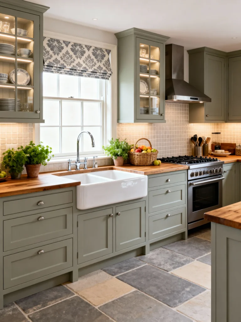 If you’re looking for a kitchen that feels incredibly cozy and grounded, this is it. The soft, sage-green cabinets are just beautiful—a lovely alternative to traditional white or gray. Paired with those warm, butcher block countertops, the whole space feels like a welcoming country retreat. And how can you not love that huge, classic farmhouse sink right under the window? The window itself is adorned with a charming damask Roman blind that adds a subtle pattern and texture. The flooring is another highlight: the large, multi-toned slate tiles provide a durable and character-filled foundation for this charming, rustic kitchen.