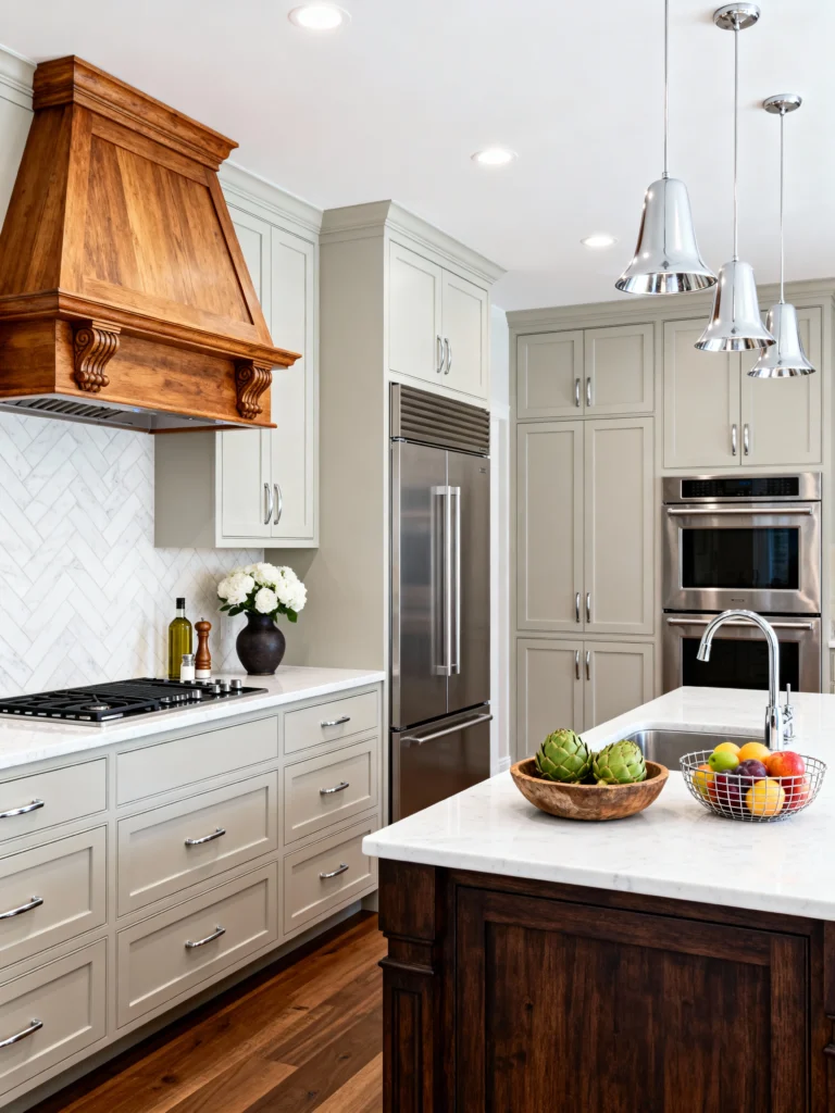 This space perfectly blends rustic charm with modern sophistication. The light, grayish-green cabinetry is calming and refined, but the real star here is that stunning, custom-made wooden range hood. It anchors the whole room and brings in a wonderful, earthy texture that contrasts beautifully with the clean white herringbone backsplash. The sleek stainless steel appliances, especially that built-in refrigerator and wall ovens, keep the look contemporary and high-end. Notice the island—the dark wood base and bright white counter add a beautiful contrast that grounds the entire design. It’s a masterful mix of natural elements and sleek finishes!