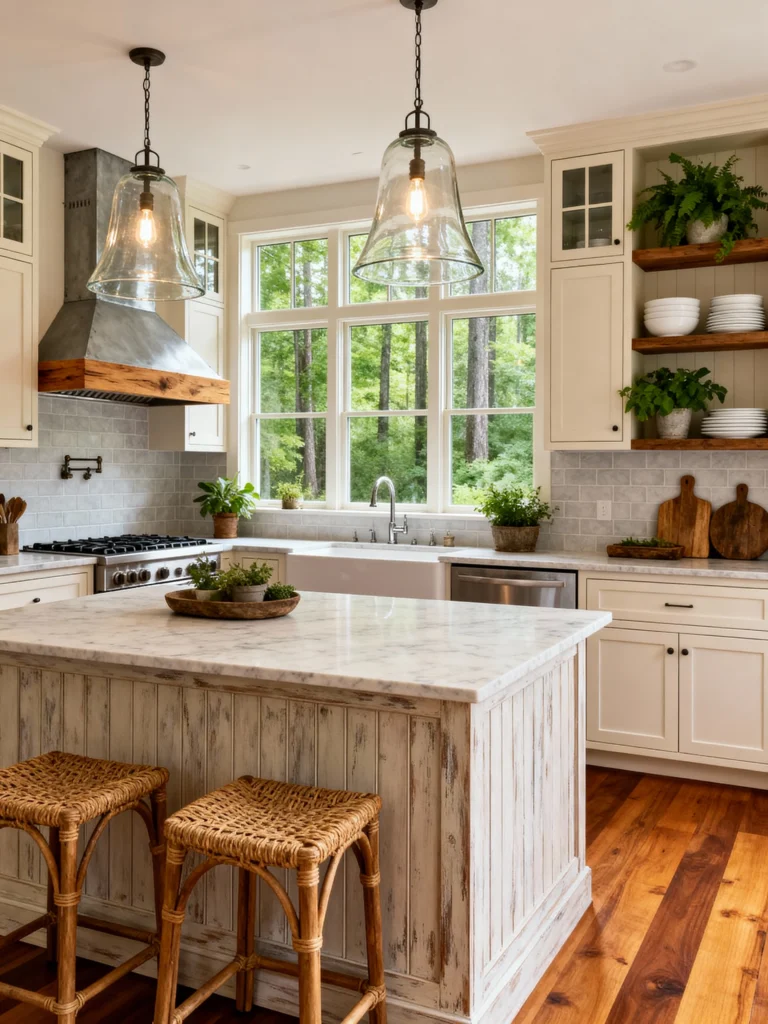 Talk about a kitchen with a view! The large window overlooking that lush greenery is definitely the focal point here. The creamy, white cabinets create a bright and tranquil atmosphere, and the open shelving with greenery adds a beautiful, organic touch. I adore the distressed, shiplap-style island—it gives the space a wonderful, coastal or farmhouse feel. Paired with those woven rattan stools, it brings so much natural texture! The large, clear glass pendant lights tie everything together, keeping the look bright and allowing the natural light to flood the space. It’s an incredibly relaxing and serene kitchen design.