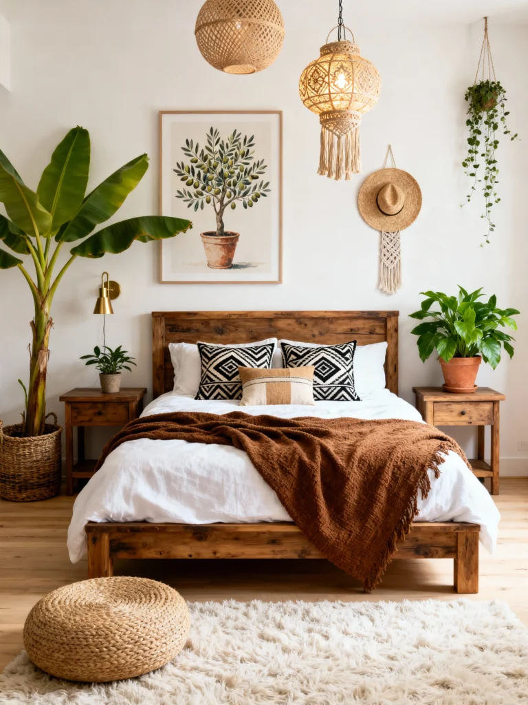 This room proves that Boho Tropical can handle some drama! The dark wood bed frame and nightstands create a beautiful contrast with the white bedding and shaggy rug. I’m obsessed with the huge banana tree—it instantly gives that jungle vibe! The framed botanical art and the geometric black-and-white pillows tie everything together, adding a grounded, sophisticated touch. And of course, the woven pendant light is a signature element that keeps it feeling relaxed.