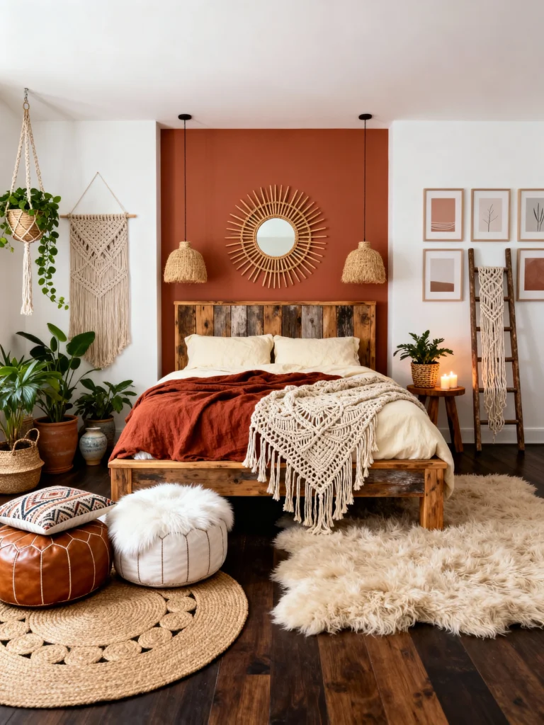 The accent wall in this rich terracotta color is genius! It instantly adds warmth and makes the rustic wooden headboard and light-colored bedding pop. The layered rugs, leather pouf, and fluffy ottoman are textural heaven on the dark wood floor. This space feels perfectly curated, from the macrame wall hanging to the framed botanical prints and the little wooden ladder adding a quirky vertical element. So many layers of cozy!