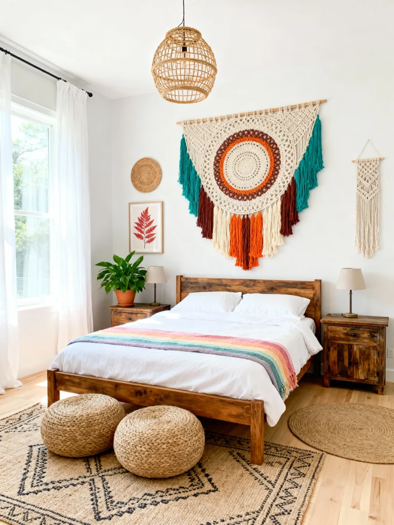 This is the fun-loving side of Boho! That giant, vibrant macrame wall hanging is an absolute showstopper, bringing in gorgeous turquoise, orange, and rust. It proves you don’t have to stick to neutrals! The simple, rustic wooden bed frame and nightstands provide a grounding base, while the little rainbow throw at the foot of the bed is just a delightful, cheerful surprise. Don’t miss the cute woven poufs and the layered rugs!