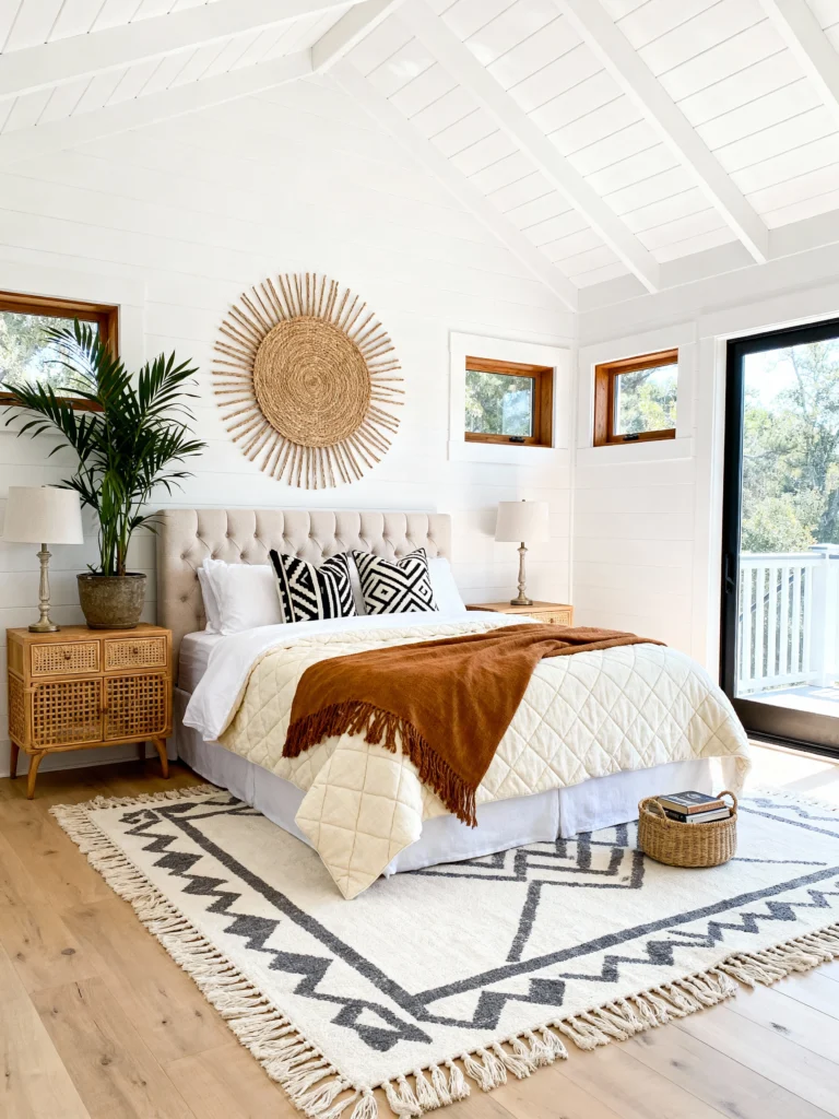 Talk about light and airy! This room feels like a seaside cottage getaway, especially with the sloped white-paneled ceiling. The large geometric rug anchors the space, and the tufted headboard adds a classic, soft touch. But my favorite parts? The wicker sunburst wall hanging and those incredible rattan nightstands. The pop of rust color in the throw adds necessary warmth, making the whole space feel inviting and bright.