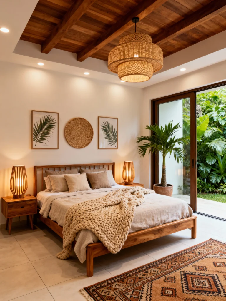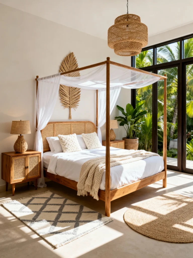 This room is so fresh and clean! The bamboo headboard is a fantastic, lightweight way to bring in that natural, earthy element. The huge picture window overlooking the lush jungle is everything! The simple white bedding keeps the room feeling airy, while the neutral pillows, small patterned rug, and the woven accents on the nightstand add that essential boho touch. It feels perfectly balanced between minimalism and tropical flair.