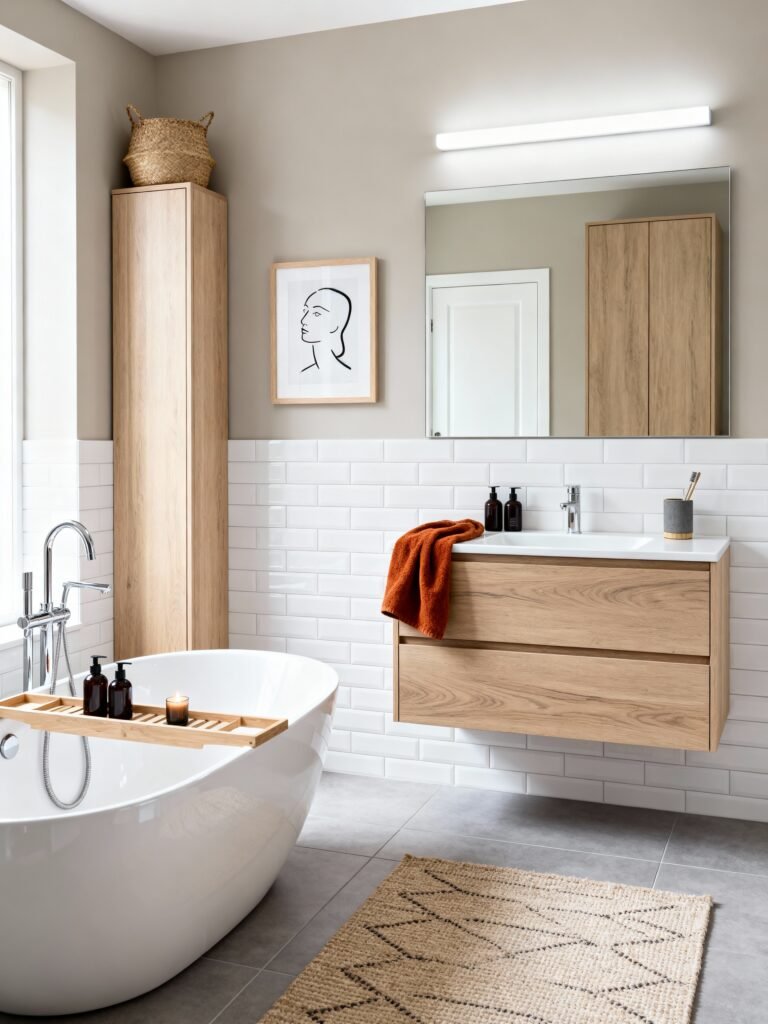 If you love the Scandi-minimalist look, this one’s for you. The light wood cabinetry and bath caddy paired with the simple grey-and-white tiled walls create a super calm, organized space. It feels warm, but totally clutter-free. Everything is streamlined and natural, making it the perfect peaceful spot to unwind.
