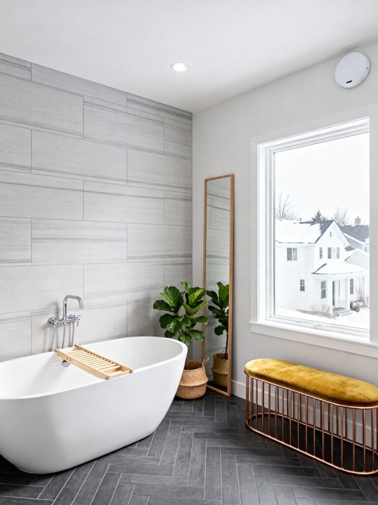 This space is all about light and texture. The pale, horizontal grain on the wall tiles and the dark grey floor create a soothing, layered look. I love the playful touch of that bright mustard yellow bench—it provides a fun pop of color and a handy spot for towels. The window overlooking the snow adds to the crisp, fresh feel! Title: Nordic Light