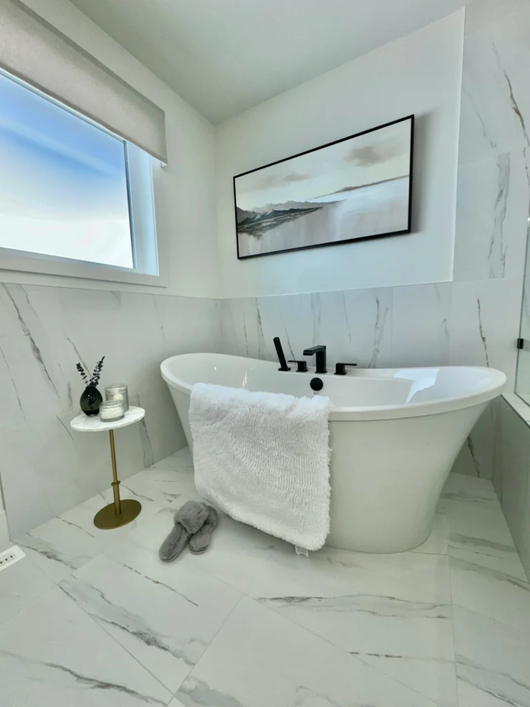 Hello, glamour! The continuous white marble-look tile on the walls and floor creates a light, bright canvas. The modern, sculptural tub and simple black fixtures add a stylish edge. They kept the accessories minimal—just a side table and a piece of art—letting the beautiful stone speak for itself.