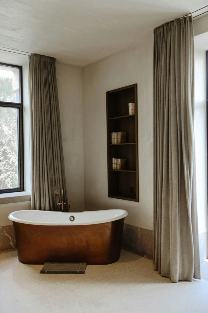 This room has an undeniable grand, European feel. The unique, reddish-brown copper tub is the star of the show. Paired with those heavy, floor-to-ceiling taupe drapes and the built-in dark wood shelving, it feels incredibly luxurious and intimate. It’s a rich, moody vibe perfect for a long, quiet read.
