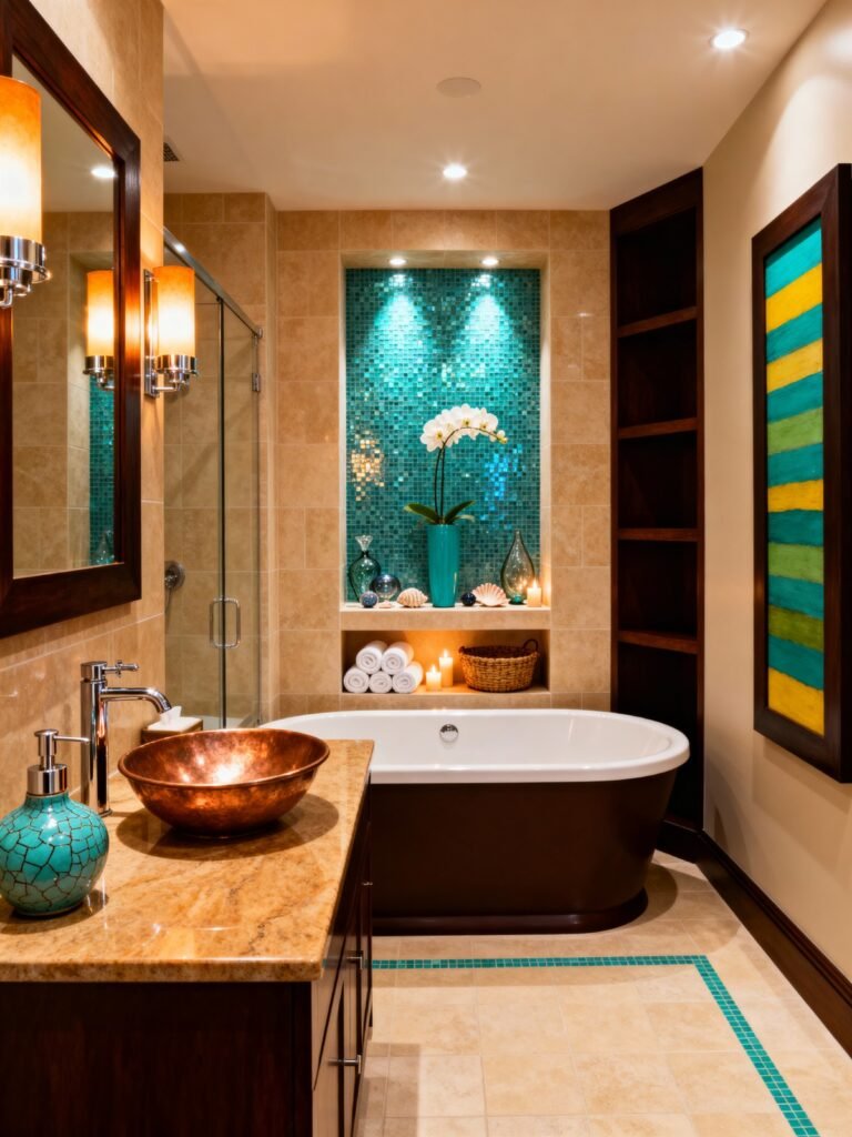 Now this is a completely different mood! If you crave warmth, texture, and a spa-like escape, take notes from this beautiful space. The earth-toned tile and rich, dark wood cabinetry create a cozy, grounded feeling. But the real ‘pop’ comes from the spectacular recessed niche featuring teal mosaic tiles and under-cabinet lighting. That copper vessel sink? Absolutely stunning—it adds a unique, artisanal touch that screams exotic retreat. From the vibrant art piece to the shells and orchids, every element contributes to a sophisticated, tropical haven. It’s perfect for unwinding after a long day!