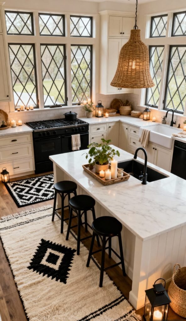 This space is a beautiful blend of cozy cottage style and striking contrast. The black-paned windows are a beautiful architectural detail, framing the greenery outside perfectly. The pairing of the creamy white cabinets with the sleek, matte black range and sink fixtures is super sharp. Can we talk about that lighting? The woven, bell-shaped pendant adds so much texture and warmth! And look at that layering of rugs—the black and white geometric patterns add just the right amount of Boho-chic pattern play and define the space. It’s the perfect spot for a snug evening.