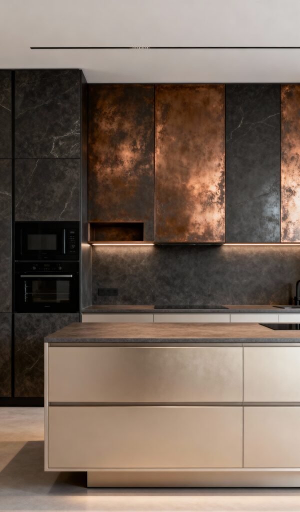 This is a kitchen that makes a statement! If you love a sleek, dramatic look, check out the moody, dark marble-effect cabinetry. But the real star is that aged, textured copper finish on the upper cabinets—it adds such a rich, industrial-chic patina. The contrast with the gold/champagne metallic drawers on the island is just stunning, making the space feel incredibly high-end and custom. The integrated black appliances and minimalist lighting keep the whole design streamlined. It’s sophisticated, bold, and definitely not your average kitchen!