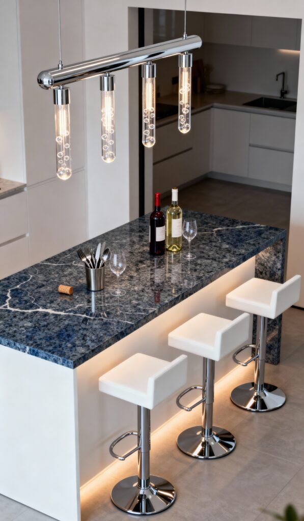 The deep, striking blue marble countertop with its brilliant white veining is the ultimate showstopper against the crisp white cabinets. It’s pure luxury! I’m obsessed with how the under-cabinet LED lighting makes the whole island look like it’s floating, creating such a chic, modern vibe. And those chrome-based bar stools and the unique cylindrical pendant light? They bring a fantastic futuristic shine. This kitchen proves that adding one incredible, high-contrast element can elevate your entire design game. Perfect for entertaining your friends with a couple of bottles of wine!