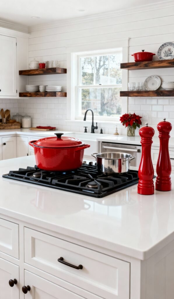 This kitchen is the perfect example of how to make an all-white space feel warm and welcoming, not stark. The crisp white cabinets and countertop are a beautiful, clean canvas, and the shiplap texture on the back wall adds a subtle, cozy detail. The warmth comes from those gorgeous, chunky wood open shelves—they are ideal for displaying colorful pieces, like that vibrant red Le Creuset pot! Speaking of color, a pop of bright red with the cookware and those giant salt and pepper mills is a fun, festive way to break up the white. It’s functional, timeless, and just gorgeous!