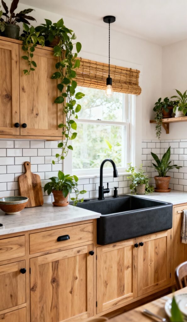 If you’re into a warm, cozy, and slightly rustic vibe, this kitchen is calling your name! I love the contrast between the beautiful natural wood cabinets and the classic white subway tile backsplash. But what really steals the show here is the greenery! Trailing pothos and potted plants everywhere—it makes the space feel so alive and fresh. The black farmhouse sink and matching faucet add a grounding, modern touch, which is perfectly balanced by that textured bamboo window shade. It’s a wonderfully layered look that’s inviting and full of personality. Total cottage-core meets modern farmhouse!
