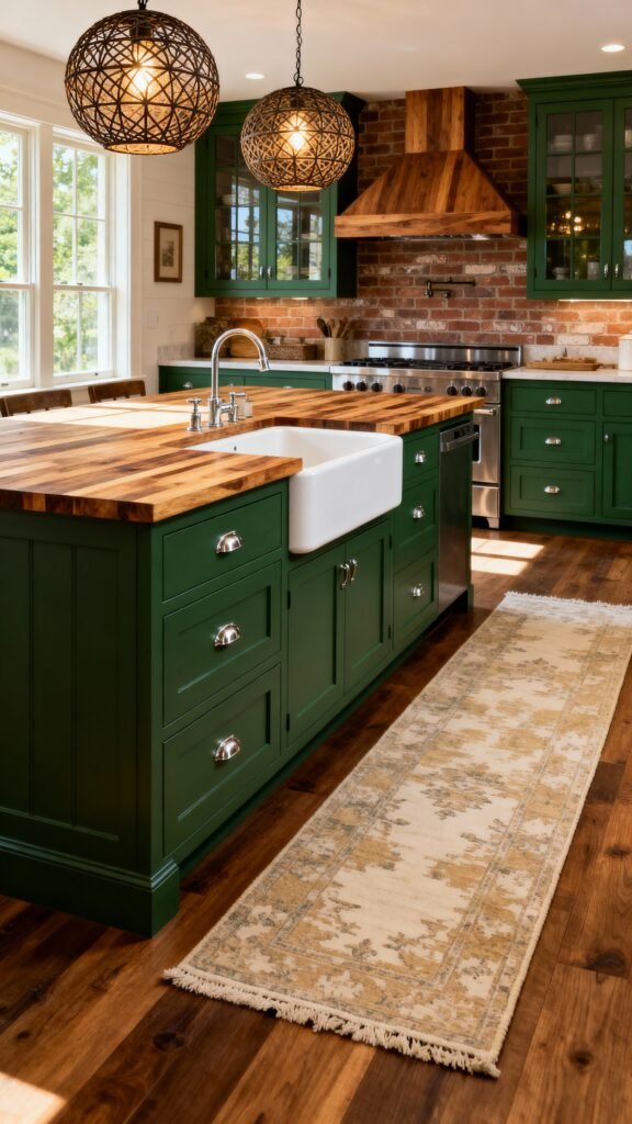 The deep, emerald green cabinets are giving me all the cozy, sophisticated vibes. It’s such a refreshing twist on classic kitchen colors. And let’s talk about that butcher block countertop! The warm wood grain is just perfection against the dark paint, providing a gorgeous spot for meal prep or just gathering around. Tucked right in the center is a classic farmhouse sink with those shiny chrome pulls—it’s the perfect blend of modern functionality and traditional charm. It truly feels like the heart of the home, don’t you think?