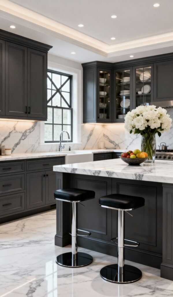 This kitchen uses deep charcoal gray cabinets to create an incredibly sophisticated and dramatic look. The dark cabinetry provides a stunning contrast to the bright white marble backsplash and countertops, making the stone’s veining really pop! Under-cabinet lighting adds a warm glow, highlighting the texture and giving the space a luxurious, cozy feel. The window trim and black-and-white bar stools tie everything together for a truly high-end finish.