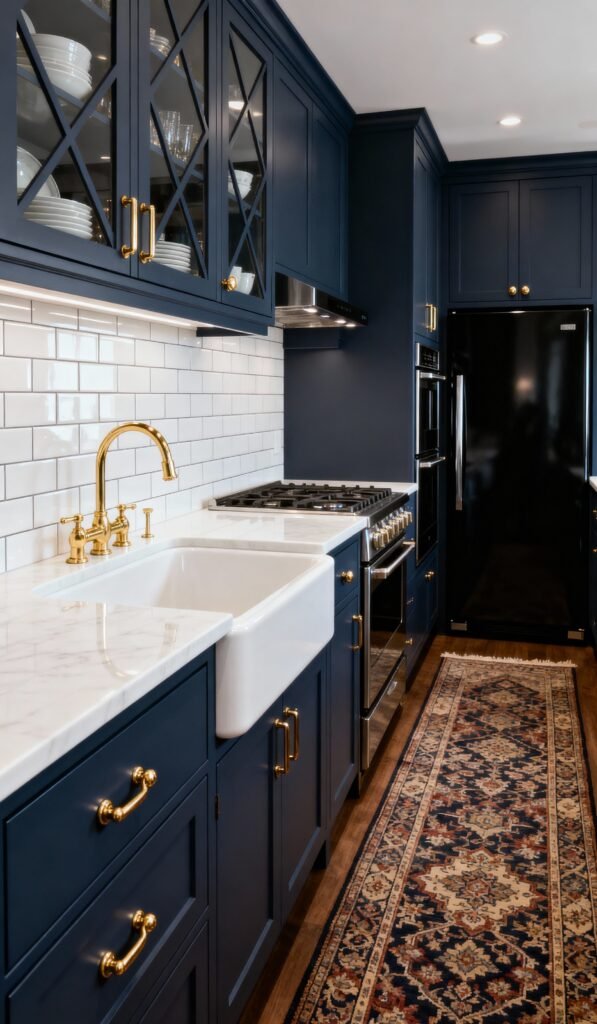 The rich, deep blue is perfectly paired with crisp white subway tiles and classic white marble countertops. But what really elevates this design is the brass hardware—from the cup pulls and knobs to the gorgeous gold faucet, it adds a warm, luxe layer. A dark rug grounds the space, and the glass-front cabinets offer a peek at the dishware, keeping the look bright and airy despite the deep cabinet color.