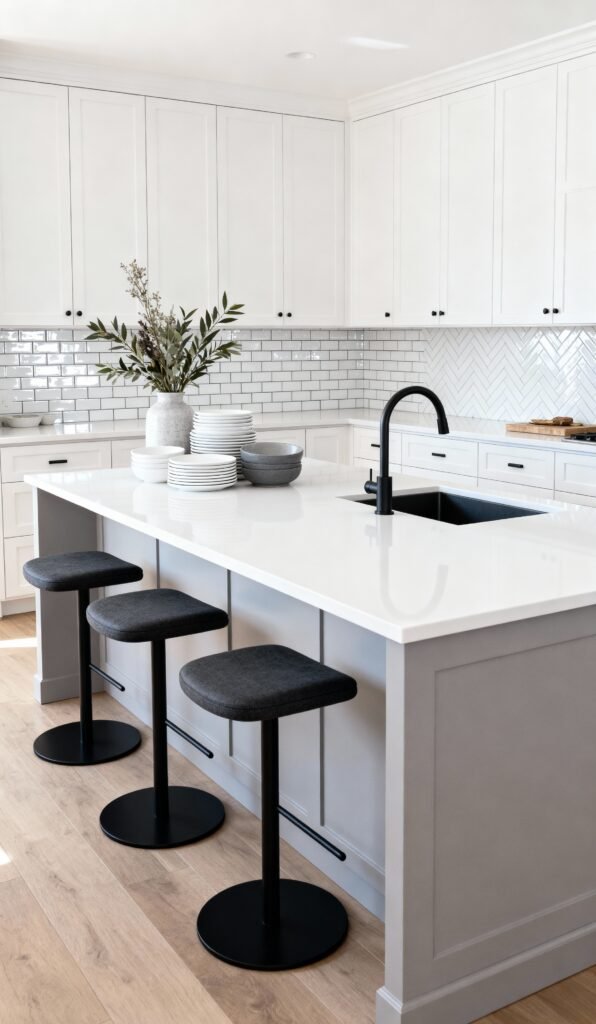 This kitchen is a great example of combining classic elements with a modern touch. The upper cabinets are a bright, classic white, but the island base features a beautiful, light cool-toned gray. This is a perfect way to add color without overwhelming the space. The black fixtures (faucet and bar stool bases) create crisp contrast, and the herringbone subway tile on the wall adds a lovely texture that really catches the eye.