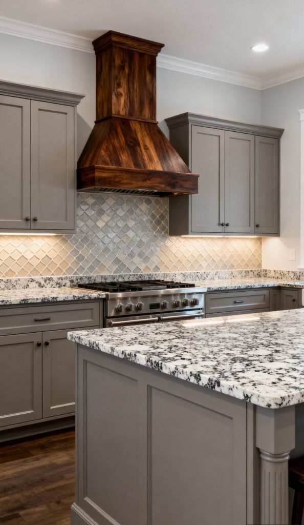 The cabinets are a mid-tone, warm taupe/gray, which plays beautifully with the earthy tones in the patterned backsplash tiles. The dark wood range hood is an unexpected feature that adds amazing rustic contrast and texture against the cool gray cabinets. The speckled granite countertop pulls the various colors together, creating a perfectly harmonious and welcoming kitchen design.