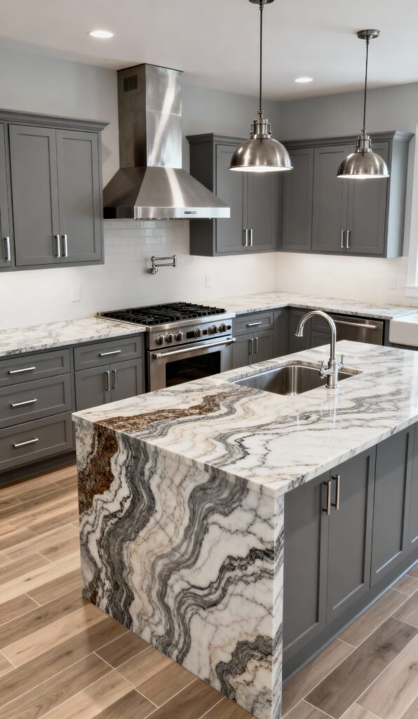 The mid-tone gray shaker-style cabinets provide a calm backdrop, but the real star of the show is that incredible island countertop. The marble features bold, high-contrast black and brown veining that spills down the sides—it’s truly a piece of art! Simple pendant lights and a stainless steel hood add industrial flair, while the wood-look flooring warms up the whole space.