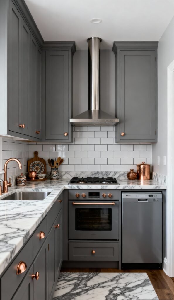 This lovely U-shaped kitchen uses a solid mid-tone gray for the cabinetry, which feels both modern and timeless. What makes this particular space shine are the copper accents—the faucet, drawer pulls, oven knobs, and small decor items—which infuse the room with warmth and personality. The classic white subway tile backsplash and crisp white marble countertops keep the small area bright and clean.