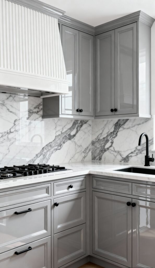 If you’re into a modern, sleek aesthetic, check out this glossy space The cabinets are a light, high-gloss gray, reflecting light beautifully to make the space feel larger and brighter. The uninterrupted marble backsplash adds a dramatic, elegant backdrop behind the cooktop. Black pulls and a black sink/faucet provide sharp, sophisticated contrast against the light cabinets and white marble.