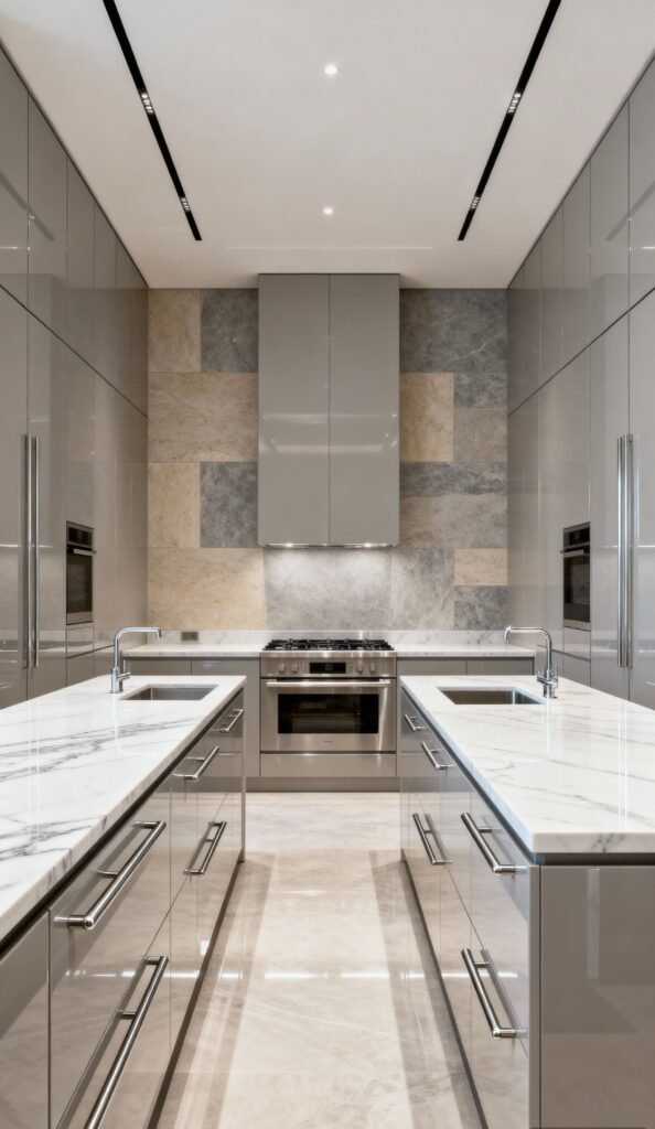 These sleek, high-gloss gray cabinets are a study in symmetry and modern design. The flat-front, handleless style emphasizes clean lines from floor to ceiling. The backsplash is a striking mix of large, rectangular marble tiles in complementary gray and beige tones. The twin marble islands provide a stunning contrast, making this kitchen a true masterpiece of minimalist luxury.