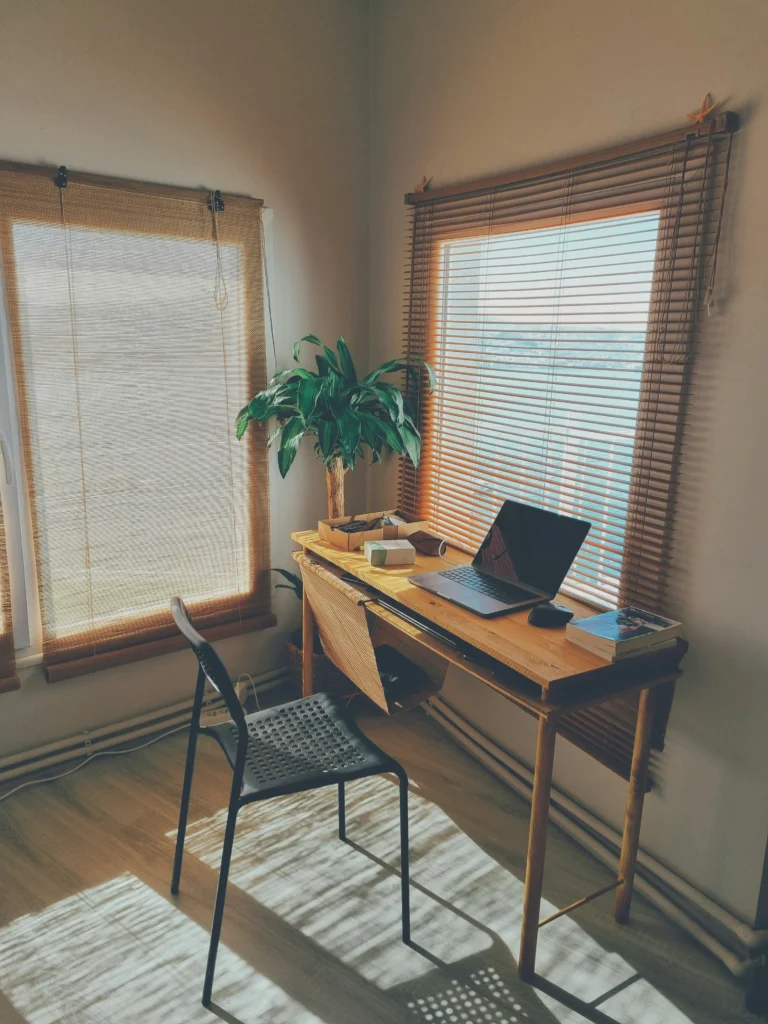 Pure golden hour vibes! The combination of the bamboo blinds and the light wood desk feels so natural and calming. The single houseplant brings a nice pop of color and life to the corner. This office proves that even a simple desk and basic chair can look incredibly inviting when flooded with natural, warm light.