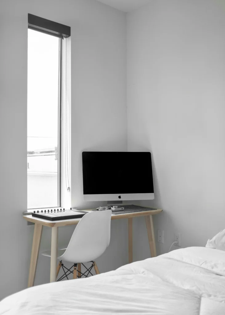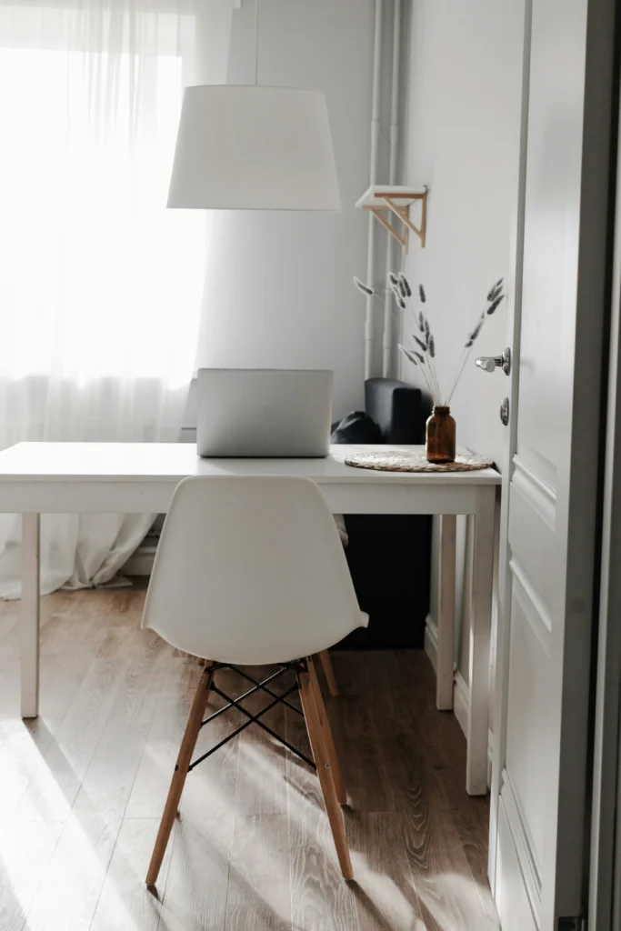 Pure and effortlessly minimal. This clean, all-white setup feels incredibly spacious and calm, which is probably thanks to that huge source of natural light softened by a sheer curtain. The classic Eames-style chair adds a touch of design flair, while the light wood floor brings in some welcome warmth. It’s a beautifully uncluttered space—just a laptop, a simple hanging pendant light, and a tiny vase of dried grasses. A perfect serene retreat!