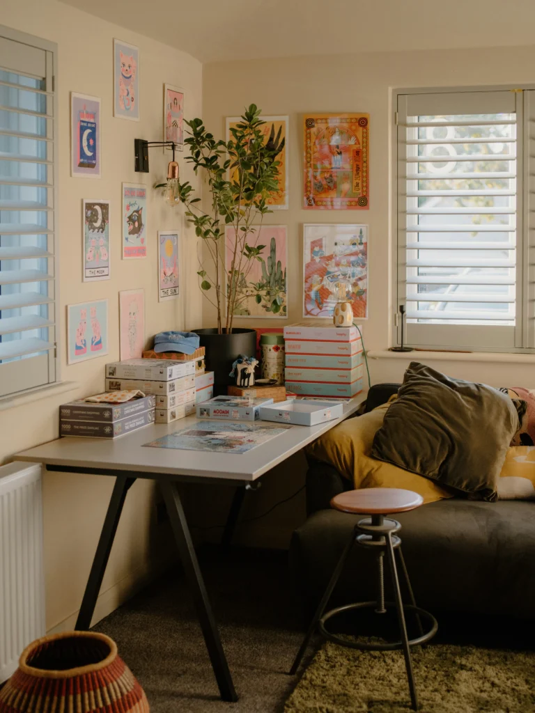 This space is an explosion of personality and fun! The gallery wall of bright, quirky art and the stacks of board games show that this corner is meant for both work and play. The large plant and the mix of textures keep the space feeling grounded and cozy, perfect for anyone who loves an eclectic, lived-in style.