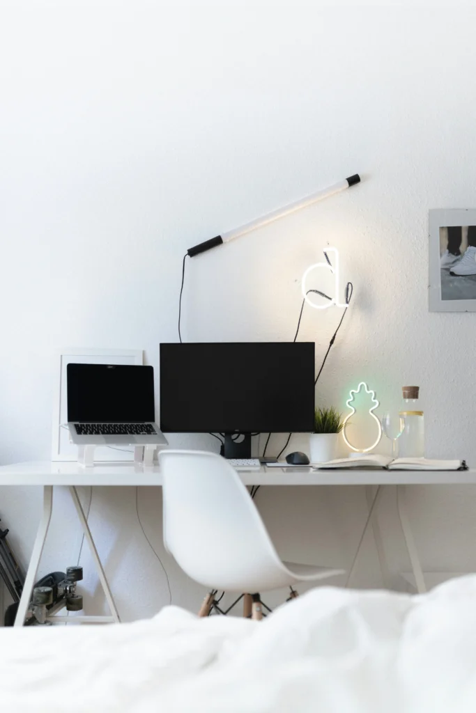 Talk about modern and clean! The white-on-white palette keeps things super minimalist, but the custom neon lights add a playful, unexpected twist. I’m a big fan of the elevated monitor setup—it’s much better for your neck! This desk setup is all about sleek lines and focusing on the essentials. It’s a great example of how to make white feel dynamic, not sterile.