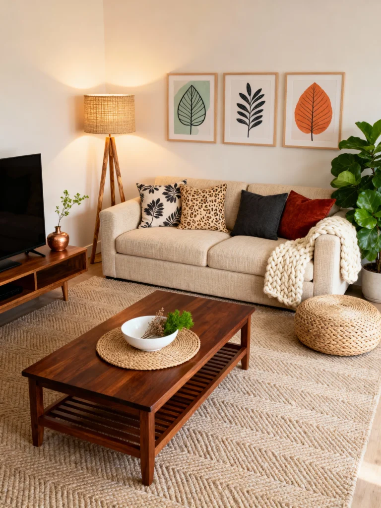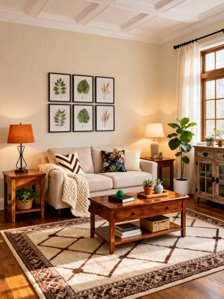 If “cozy” was a picture, this would be it. I love how this room feels like a warm hug! The botanical prints on the wall bring a bit of the outdoors in, and that rich wood coffee table just anchors the whole space perfectly. It’s the kind of room where you can actually imagine yourself curled up with a book and a chunky knit blanket. The symmetry with the two side lamps makes it feel organized but still totally lived-in and approachable.