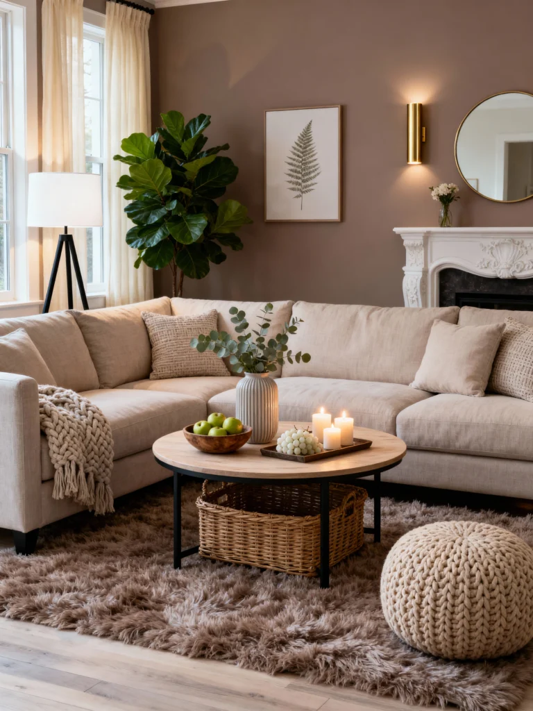 Can we talk about that mauve-chocolate wall? It’s such a bold choice that pays off by making the room feel incredibly intimate. The oversized sectional looks like the ultimate spot for a movie marathon. What really catches my eye here is the mix of circular elements—the mirror, the round table, and that knit pouf. It softens the whole look and makes the flow of the room feel really natural. It’s sophisticated but definitely not “stiff.”
