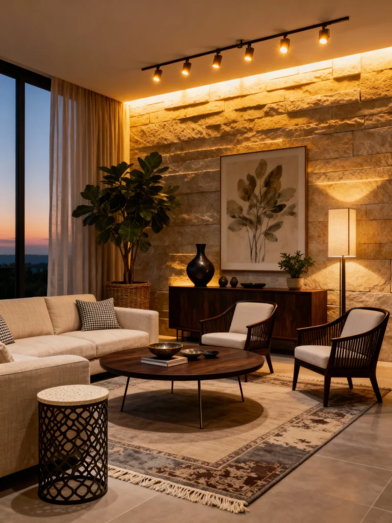 If you’re into drama, this one is for you. That stone feature wall is a total showstopper, especially with the warm track lighting hitting it just right. It feels like a high-end lounge or a luxury hotel suite. The dark wood furniture and those sleek, curved armchairs give it a mid-century modern edge that is very “in” right now. It’s the perfect setting for an evening glass of wine as the sun sets through those massive windows.