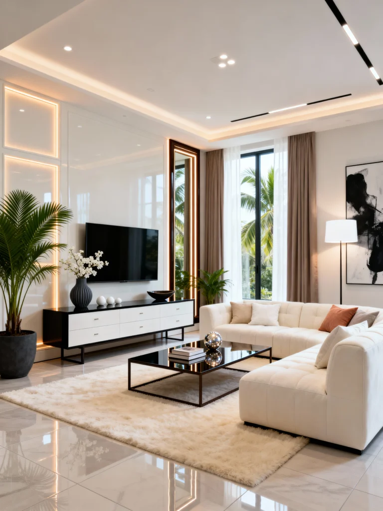 Welcome to the future of chic! This room is so crisp and clean, it feels incredibly refreshing. The backlit wall panels and the high-gloss floor give it a super expensive, polished look. I love how the black TV console creates a sharp contrast against the white walls. And notice how that huge palm tree in the corner keeps it from feeling too “cold”—it adds just the right amount of life and color to a very structured space.