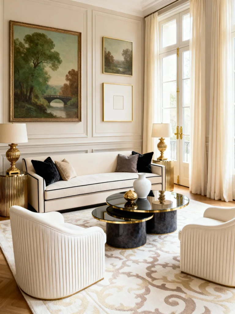 This is for the person who loves a bit of “old-world” glamour but wants to keep it modern. The wall moldings and those stunning gold-based lamps are pure elegance. The coffee table is the real star here, though—that tiered, black-and-gold marble design is basically a piece of art. It’s a very symmetrical, formal layout, but the soft cream tones keep it feeling airy and bright rather than heavy.