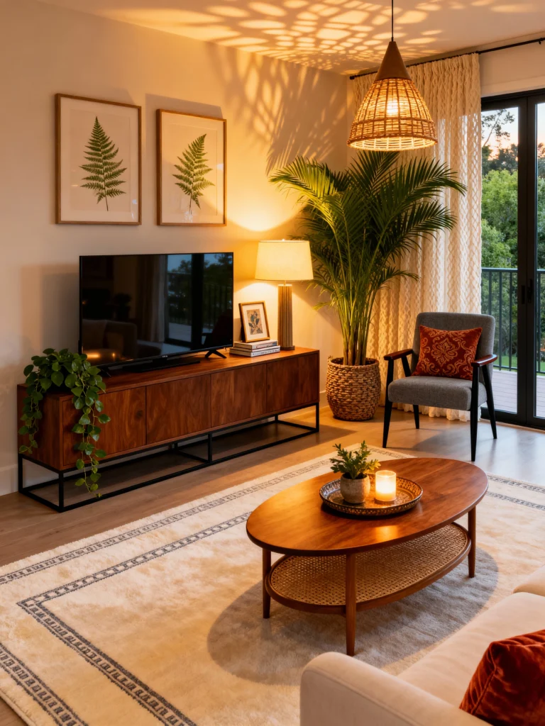 There is something so magical about the lighting in this room. That wicker pendant light casting shadows on the wall creates such an amazing atmosphere. It feels like a tropical vacation home! The mid-century TV stand and the simple fern prints keep the styling clean, while the pop of orange in the pillow adds that sunset-inspired warmth. It’s a great example of how you can use lighting to completely change the mood of a room.