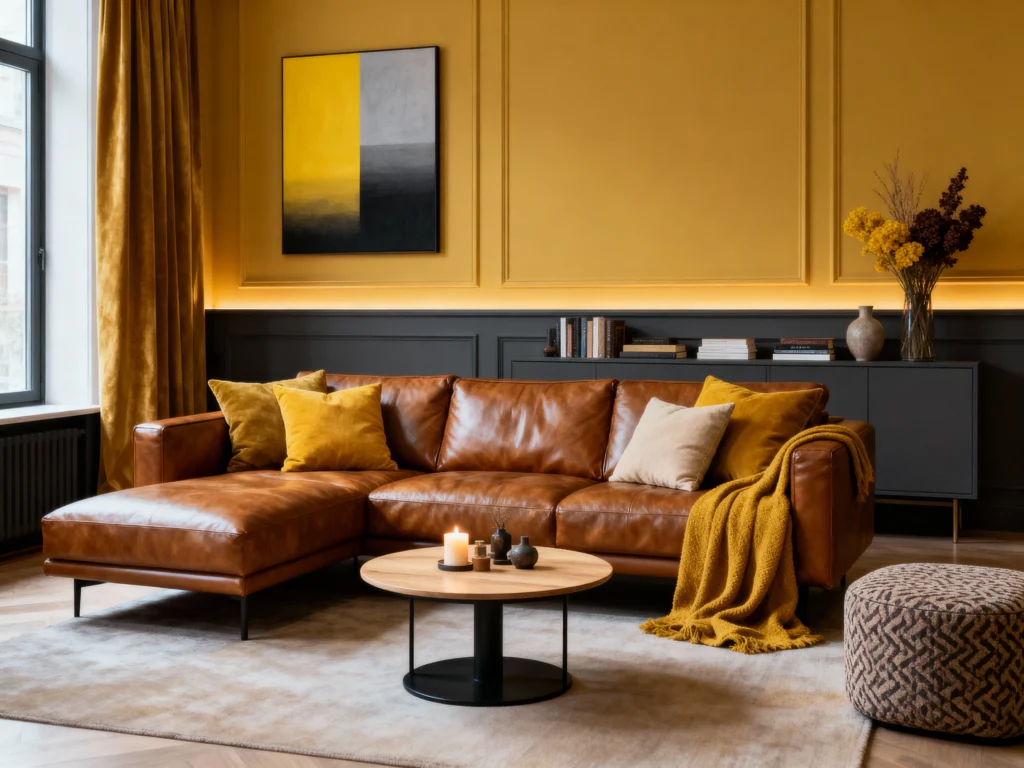This is another beautifully executed example of using bold color with dark accents. The warm tan leather sectional is inviting and comfortable, beautifully offset by the mustard yellow wall and the sleek, dark gray lower paneling and console. The chunky throw blanket and cushions in coordinating warm tones add texture. It’s a balanced, contemporary space that feels grounded yet bright—a perfect mix of sophistication and coziness.