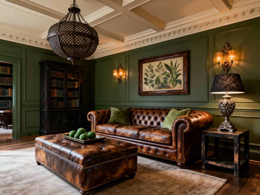 This is pure, timeless elegance. The deep olive green paneling creates a moody, intellectual atmosphere, making it feel like a distinguished old study. That rich, tufted leather sofa is the definition of classic charm—I can practically smell the wood polish and old books! Paired with the heavy, dark wood cabinetry and the rustic iron chandelier, it’s a sophisticated sanctuary. The lighter rug and ceiling keep it from feeling too dark, offering a perfect, cozy retreat.