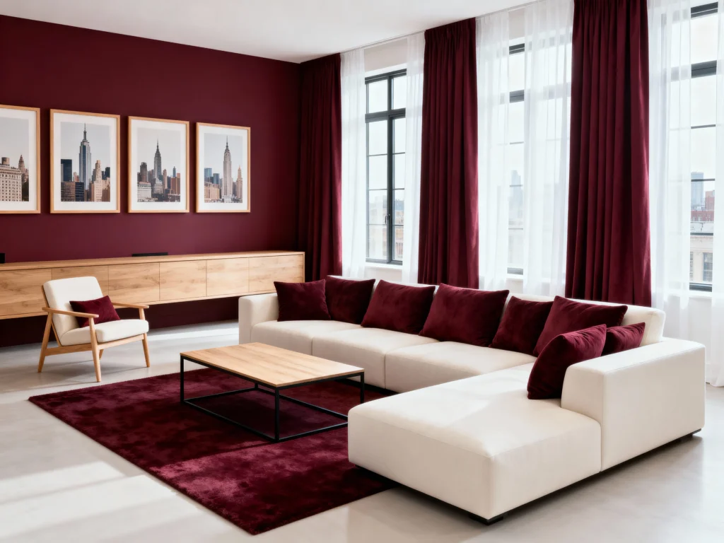 The deep maroon accent wall and matching floor-to-ceiling curtains are everything. They provide a rich, luxurious backdrop for the crisp, clean lines of the oversized white sectional sofa. The contrast is simply beautiful—it feels both modern and incredibly cozy. The simple wooden coffee table and the clean cityscape art maintain a contemporary feel, while the plush maroon rug ties the color palette to the floor. It’s chic, bold, and totally inviting.