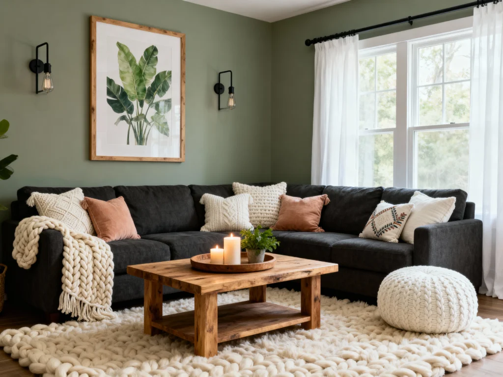 This room has such a lovely, calming vibe! The dusty sage green wall is the perfect subtle backdrop for that cozy, dark gray sectional. The real stars here are the textures—the chunky, hand-knitted rug and the variety of soft, patterned cushions and throws make it look like the ultimate spot for a relaxed weekend. The chunky wooden coffee table adds a beautiful rustic touch. It’s a perfect blend of natural elements and homey comfort!
