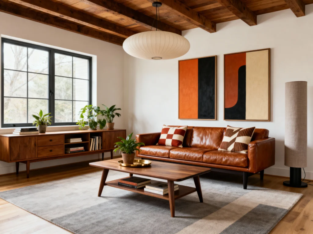 The caramel leather sofa is a classic, perfectly paired with that sleek, low-profile wooden coffee table and coordinating sideboard. The exposed wooden ceiling beams add a lovely, rustic warmth, contrasting nicely with the crisp white walls. The colorful, geometric artwork and the iconic paper lantern light fixture complete the timeless, relaxed aesthetic. It feels warm, inviting, and effortlessly stylish.