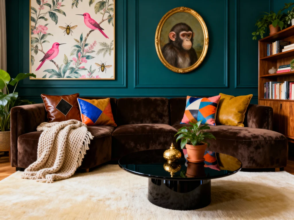 This is a maximalist dream! The rich, jewel-toned teal wall with wainscoting creates an instant feeling of depth and personality. The deep chocolate velvet sectional is luxurious, and the playful gallery wall (hello, monkey portrait!) and bright, geometric throw pillows add so much eclectic charm. It’s a daring color combination that works beautifully, making the room feel dramatic, sophisticated, and full of fun character.