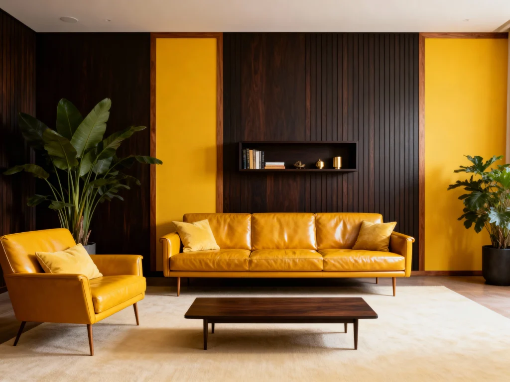 This room is a showstopper for those who love bold color! The combination of dark wood paneling and vibrant mustard yellow walls and seating is incredibly striking. The monochromatic yellow leather sofa and armchair are so chic and fun. It’s a bold, high-contrast look that feels modern and energetic. The clean lines and large, architectural plants complete the look, making it feel like a sophisticated space to brainstorm or relax.