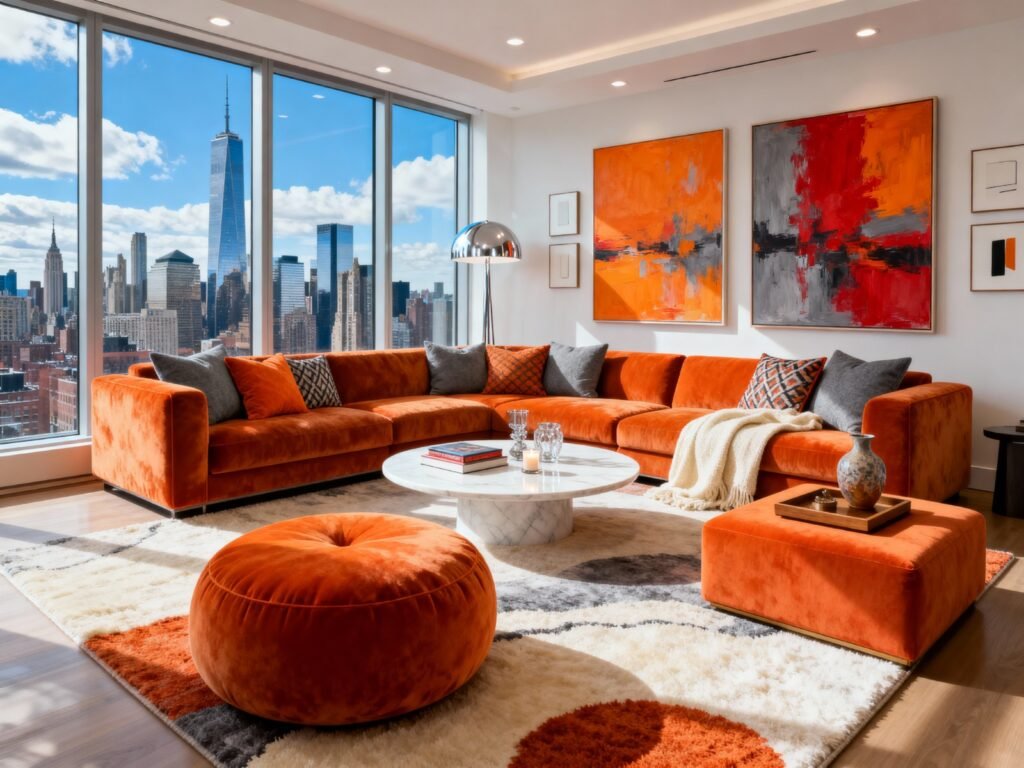 This space is a masterclass in using bold color! The centerpiece is that incredible, oversized burnt orange velvet sectional—it’s like a warm hug. It perfectly sets the tone for a cozy, yet modern, high-rise living room. The abstract artwork in matching oranges and reds ties the whole look together beautifully, especially with that stunning New York skyline backdrop. And that giant, velvet pumpkin? A fun, seasonal touch that just adds to the room’s warm, inviting charm.