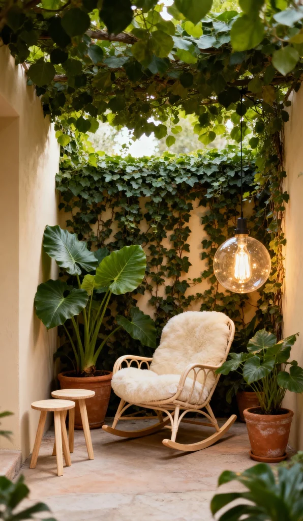 This small, sheltered spot is a breath of fresh air! The overwhelming greenery—with ivy covering the walls and vines creating a natural canopy—makes it feel like a secret garden hideaway. the light, natural rattan rocking chair, topped with a fluffy sheepskin throw, looks unbelievably comfortable. It’s simple, minimalist, and perfectly executed—a serene corner for reading, relaxing, and just enjoying the quiet surrounded by nature.