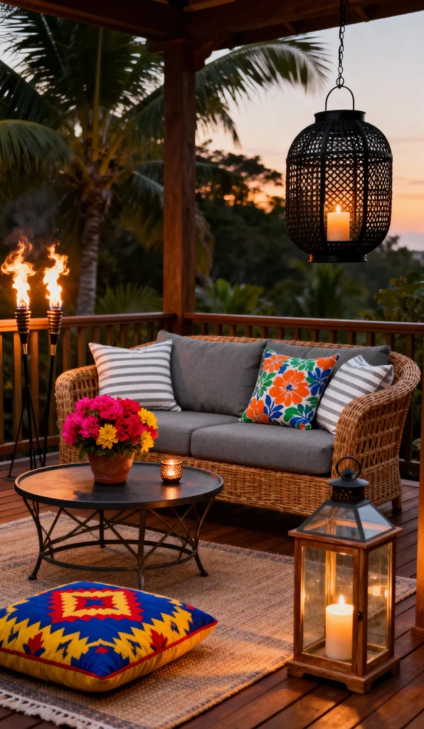 What a view! This looks like a perfect tropical balcony setup. The warm wooden deck and the wicker furniture blend beautifully with the natural backdrop. I adore the mix of bright, colorful pillows (especially that fun floral one!) against the neutral gray cushions. The lighting here is perfectly balanced, with the dramatic black hanging lantern and the exciting flame torches adding real personality and a hint of drama as the sun goes down. A sweet, cozy, and vibrant space!