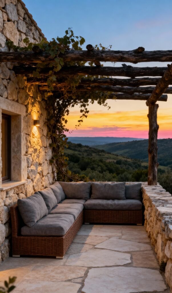 Talk about a view! This patio feels like it’s straight out of a beautiful Mediterranean or European countryside home. The rustic stone wall and floor, paired with the organic pergola structure wrapped in vines, create amazing texture. The modern, comfortable gray sectional contrasts beautifully with the rugged stonework, offering a luxurious place to sit back and truly soak in that breathtaking panoramic view at sunset.
