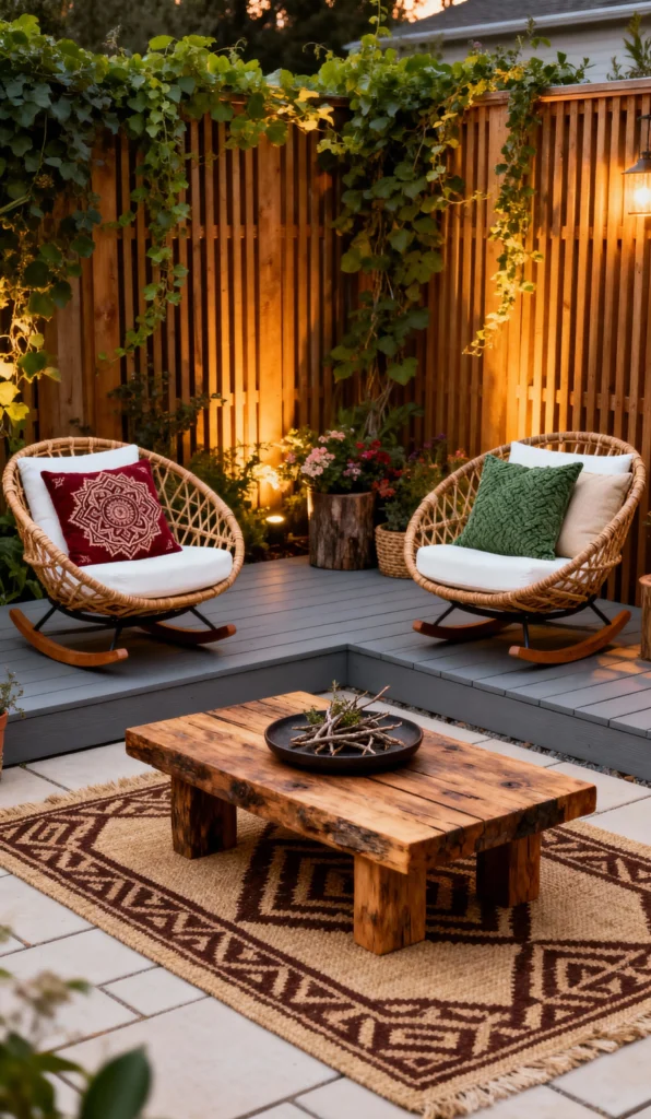 This little nook feels incredibly private and inviting! The combination of the warm under-lighting and the vertical wood slat fence covered in climbing greenery creates such a secluded atmosphere. Those woven rocking chairs with plush cushions look like the perfect spot to unwind after a long day. And that rustic, low-slung coffee table adds a beautiful, grounded texture, making this elevated deck area a true twilight escape. It’s all about mixing natural textures for maximum coziness.